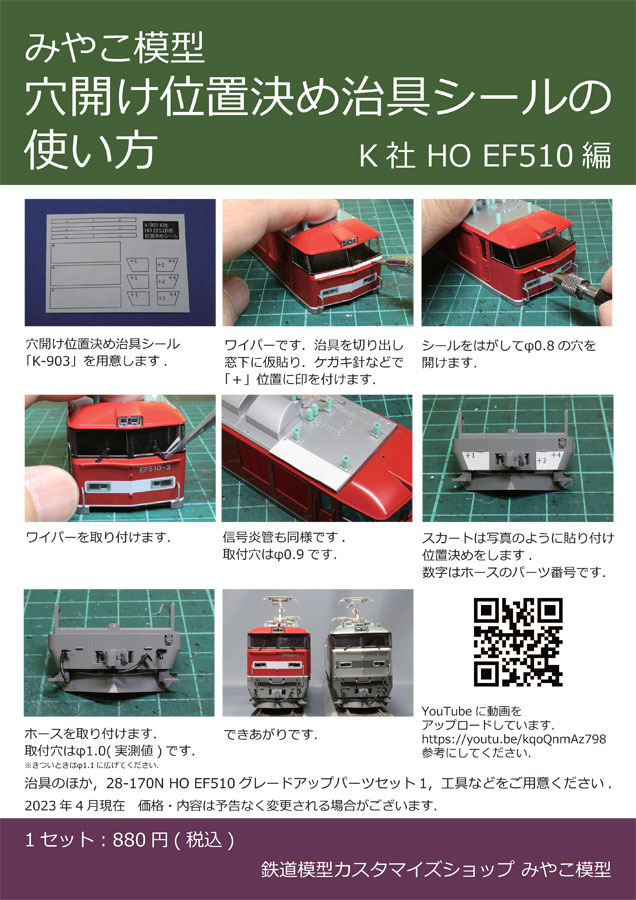 28-170N HO EF510用グレードアップパーツ1のワイパー、信号炎管、エアホースの穴開け位置を決めるためのシールです。車体やスカートに仮貼りし、ケガキ針などで位置決めをしてください。